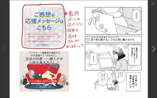 こんにちは。&Sofaチームメンバーのたしろです。 今回は、&Sofaの感想フォームについて、お話をしたいと思います。&Sofaでは、各作品の最後に、感想フォームに飛ぶボタンがあるのです! 漫画では、各話最終ページの次ページに設置してあります。 アルテイシ…